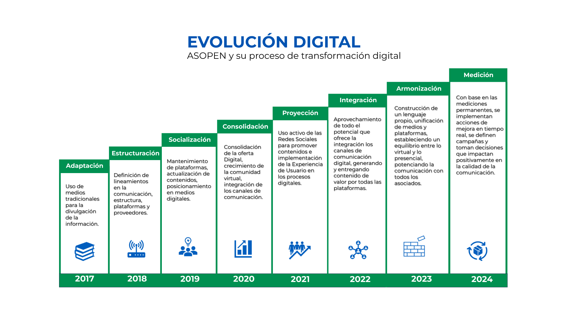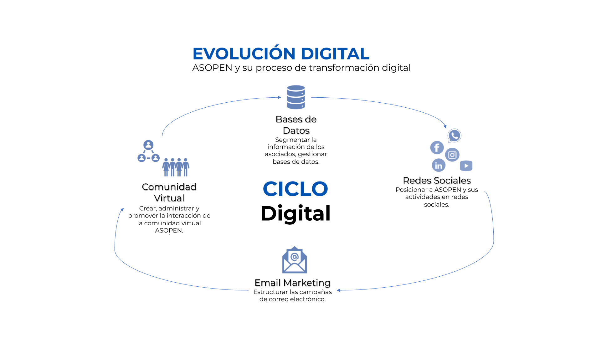 Para atender oportunamente a los asociados desde el año 2017 ASOPEN viene realizando un proceso de transformación digital que ha permitido integrar el Sitio Web, Facebook, YouTube, Instagram, WhatsApp, Correos Masivos y LinkedIn.